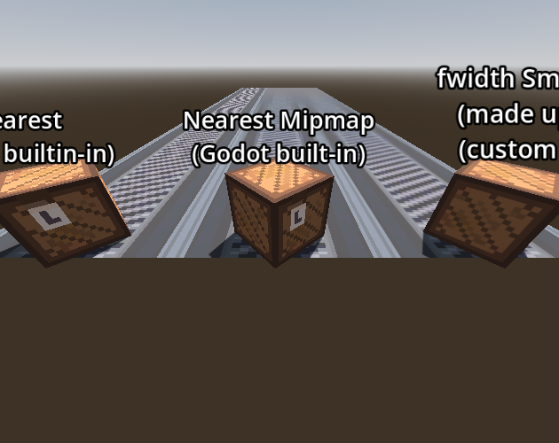 The left set of objects is plain nearest neighbor interpolation. The middle set is using Godot's "Nearest Mipmap," which I would guess (but have not researched!!) is basically using mipmaps that are themselves blurred, but still using nearest neighbor for the interpolation. The right set of objects is using a shader based on smoothly interpolating between the edges of pixels when necessary, using fwidth() to compute the threshold (so that it smoothly changes based on the distance to the sampled pixels, essentially).